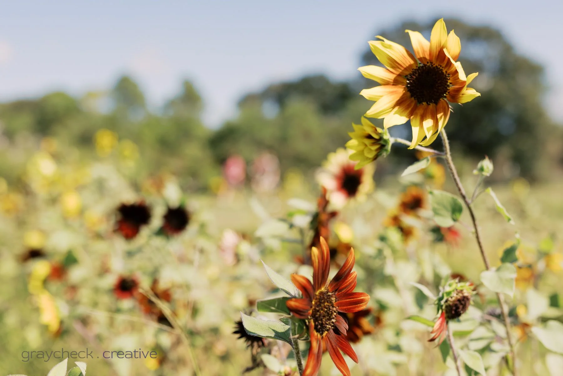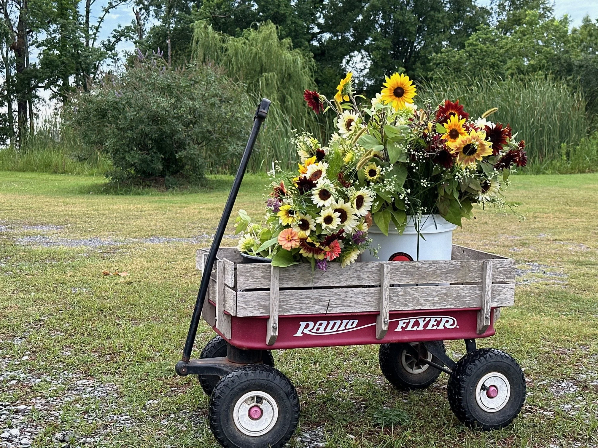 Join us for a you-pick experience. Wander our fields, take in the fresh air, fill a bucket ($40) or mason jar ($25) of beautiful blooms, and maybe pet a donkey or cow along your adventure. We currently have Autumn Beauty sunflowers in bloom, along with other wildflowers and decorative grasses are scattered around the property to include in your arrangements.